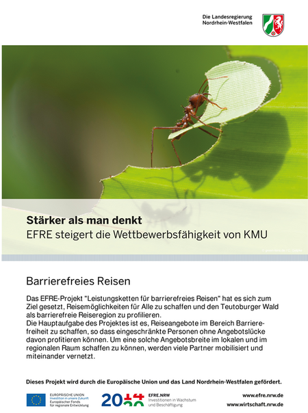 Das EFRE-Projekt „Leistungsketten für barrierefreies Reisen“ hat sich zum Ziel gesetzt, Reisemöglichkeiten für ALLE zu schaffen und den Teutoburger Wald als barrierefreie Reiseregion zu profilieren. Die Hauptaufgabe des Projektes ist es, Reiseangebote im Bereich Barrierefreiheit zu schaffen, sodass eingeschränkte Personen ohne Angebotslücke davon profitieren können.