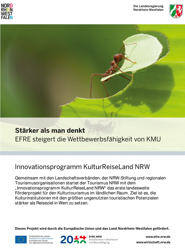 Gemeinsam mit den Landschaftsverbänden, der NRW-Stiftung und regionalen Tourismusorganisationen startet der Tourismus NRW mit dem Innovationsprogramm „KulturReiseLand NRW„ das erste landesweite Förderprojekt für den Kulturtourismus im ländlichen Raum.